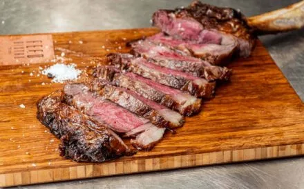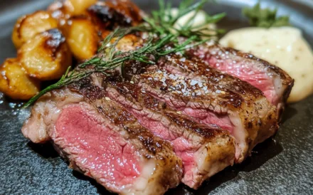 1. Varm en pande. Når panden er rygende varm, svitses bøffen af i 2-3 minutter på hver side. Skru ned for varmen, tilsæt smør og steg bøffen i yderligere 2-3 minutter på hver side. Lad herefter bøffen hvile.