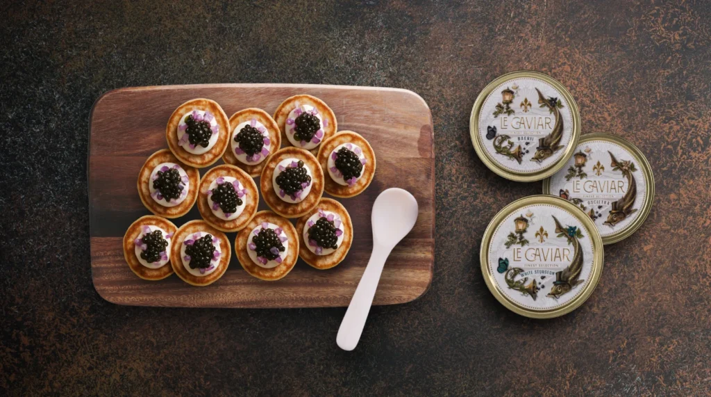 Opbevar ved 0–4 °C og tag først kaviar ud, når du dækker op. Sæt dåsen på knust is, så temperaturen er stabil under serveringen. Brug skeer af perlemor, horn, glas eller plast – metal kan forstyrre smagen. Anret hellere flere små serveringer end én stor. Tænk balance: kaviar er naturligt salt, så vær varsom med ekstra salt og skarpe syrer. Server kaviar som første servering, mens smagsløgene er friske.